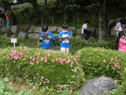 一人ずつ,自分のタブレット端末をもち,前庭の植物の様子を