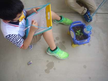 5月の連休明けにまいた種が芽を出し始めました。今日は「子葉」の様子を観察・記録しました。「ふわふわした」「つるつるした」というような,独自の表現をする子もいました。