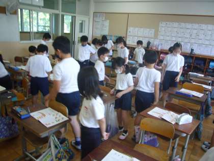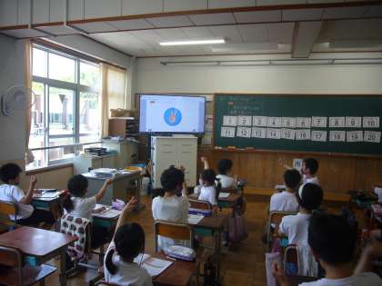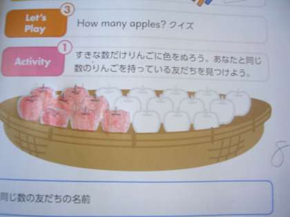 友達が何個のリンゴの色を塗ったかを数えたり,じゃんけんをして勝った数を数えたり,英語で数を数えることを経験する学習をしました。言葉で話し合わなくても,友達のノートを見て回ることで考えを交流する方法にも慣れています。