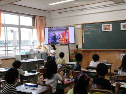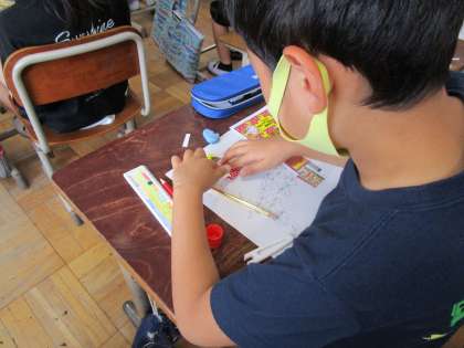 社会科の学習で「商店のはたらき」について学習している3年生。お店の写真やチラシをもとに,工夫されていることや店の品物がどこからきているのか等について学習をしました。