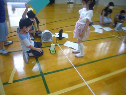 「風の強さをかえると,ものの動き方はどのようにかわるのだろう。」という学習問題に対し,実験を行って解決していきました。実験をするだけではなく,そこから考えられることを整理する力をつけているところです。グループで協力して活動することができていました。