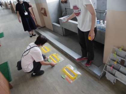 学校では,手洗い場にポスターを貼ったり,距離をとって使用できるようにラインを引いたりと,さらにいっそうの感染防止対策の徹底に向けて,教職員みんなで準備をしています。