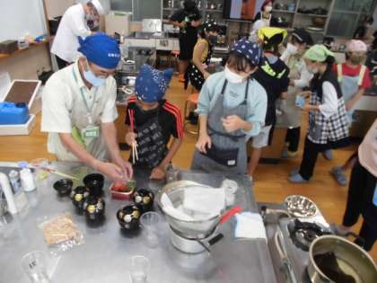 その後,子どもたち自身があわせだしを作り,湯葉,人参,小松菜,ゆずの