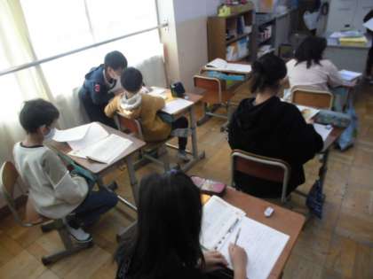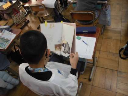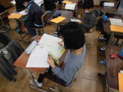 国語の学習で,組立を考えて民話を紹介する文を書いています。
