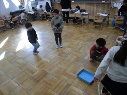 子どもたちが,お手玉を箱に投げ入れていました。
