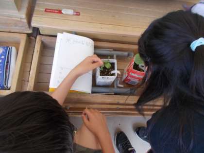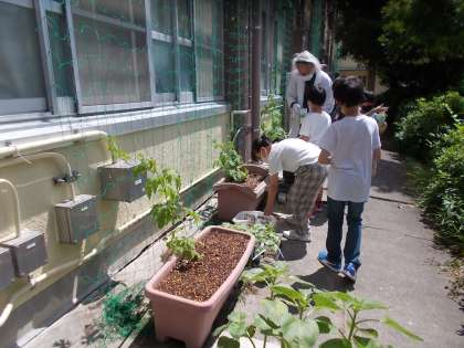 まいた種から芽が出て,葉の数も増えたとうれしそうな子ども達。