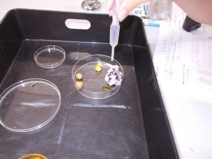 「植物の発芽と成長」の学習で,発芽する前の種子には発芽に必要な養分が含まれているのかを調べるためにヨウ素液を使った実験をしました。また,インゲン豆以外の種子や普段食べている米にもデンプンが含まれているかを調べました。結果に驚きながらも,しっかりと結論を導き出すことができていました。