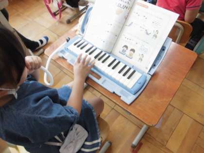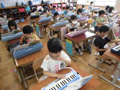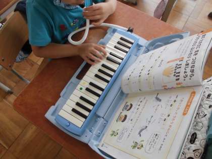 2年生になって初めての鍵盤ハーモニカです。久しぶりの鍵盤ハーモニカに子どもたちもドキドキ。指の置き方からタンギングまでおさらいをして,いざ挑戦!