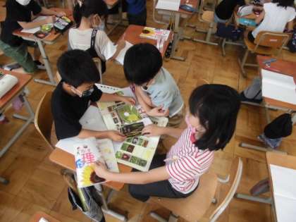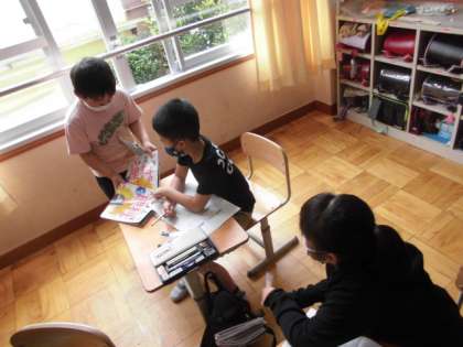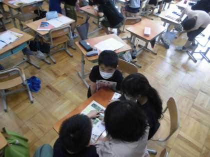 子どもたちがグループで話し合っています。