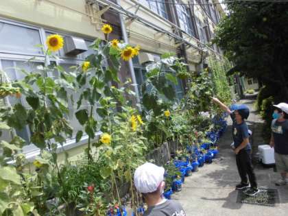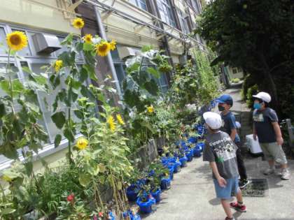 ひまわりと背比べをして,ひまわりの高さに
