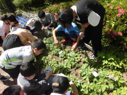 前庭のじゃがいもの葉にアルミはくをまきました。