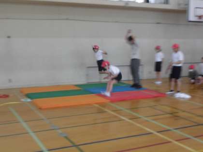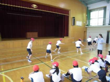 体育館では、立ち幅跳び、反復横跳びに挑戦。