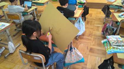 図工で「わくわくわりピンワールド」という学習をしています。わりピンを使って2枚の画用紙をつなげ、作品を作っています。今からどんな作品ができあがるのかが楽しみです。