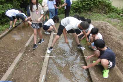 6年生が花壇の草抜きから一生懸命がんばってきました。花壇の土を耕し(田おこし)、水を入れ(代かき)、楽しみにしていた田植えをしました。稲の苗を指でつかんで倒れないように土の中に植えました。これからどのように大きくなっていくのかを楽しみにしながら、成長を見守りたいと思います。