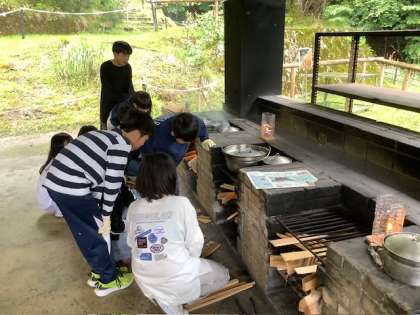 火起こしの火を使って、カレー煮込みとご飯を炊きます。
