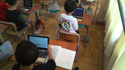国語科「ローマ字」の学習で、伸ばす音の表記の仕方を学習しました。ローマ字で伸ばす音を含んだ言葉をかき、クイズにして解き合いました。