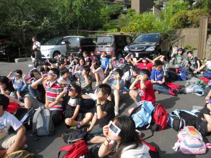 修学旅行2日目,朝から太陽が照りつけ,最高の天気となりました。しかも金星が太陽の前を横切るという珍しい現象とぴったりとタイミングが合い,香川県での観察となりました。すばらしい!!
