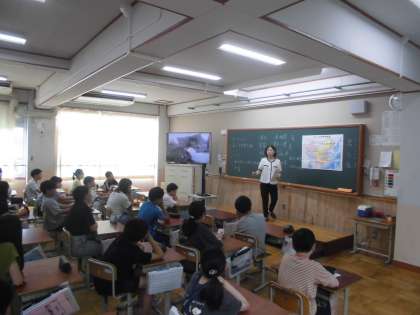 また、中国の小学校の生活の様子や暮らしの様子などについてもたくさんの写真のスライドで分かりやすく紹介をしてくださいました。特に、冬の間の体育では運動場でアイススケートを行う様子や学校の制服や授業の様子、給食の様子や避難訓練の様子などに驚いていました。