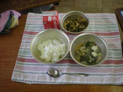 その後,子どもたちの給食の様子を参観し,実際に給食を食べました。この日の献立は「ごはん・牛乳・肉みそいため・もずくのスープ」です。