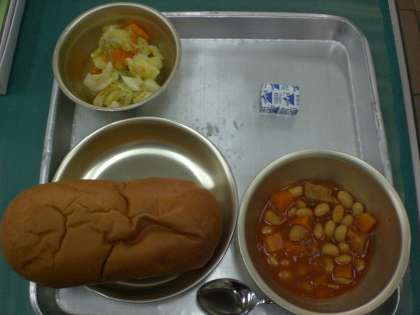 今日の献立 黒糖コッペパン ポークビーンズ 野菜のホットマリネ チーズ