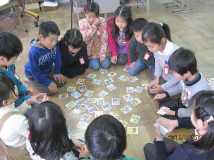 教室では,今年がんばりたいことや楽しみにしていることを発表したり。「カルタ」をしたりして過ごしました。