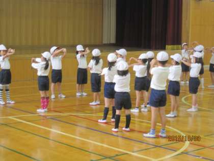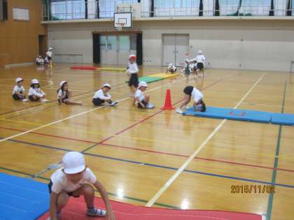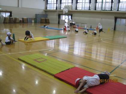 今,体育科では「マットあそび」に取り組んでいます。安全に学習するための約束を確認し,自分たちでマットを運び,首や手首など「マットあそび」でよく使う部位を中心に「体ならし」をします。「よこまわりランド」「かえるの足打ちランド」「前回りランド」「後ろ回りランド」とそれぞれの「ランド」を移動して楽しく練習します。