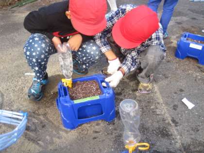 茶色や黒の小さな種を,落とさないよう大事に大事に植えました。