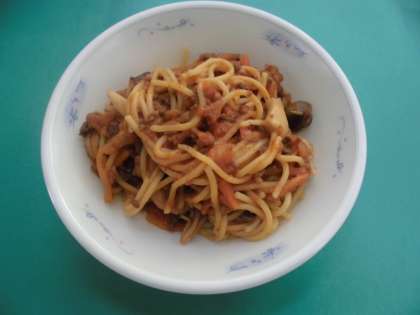 スパゲティのミートソース煮・ほうれんそうのソティ・みかん