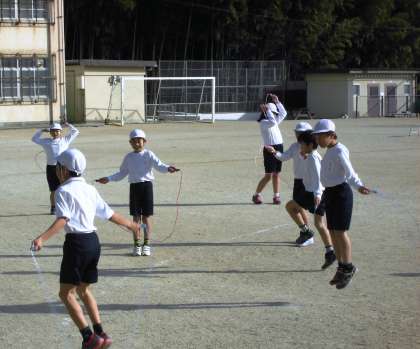 二重とび・交差とび・かけ足とび等いろいろなとび方がありますが,子どもたちは,暖かい日差しの中,友だちと一緒に練習をしています。