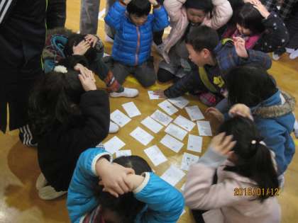 「モモキッズ」の班ごとに円になって,詠んでもらった札を低学年・高学年の順で探します。