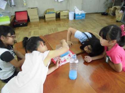 体験を通して知識の定着につながるよう,実際にいろんな容器で水を量ったり,くらべたりしています。