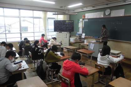 少し大きい机や椅子に緊張しながらも、中学校の教室の雰囲気を味わいながら、クラスごとに中学校の先生方による数学・社会・英語の授業を体験しました。