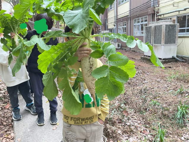 生活科の「おいしいやさいをそだてたい」の学習で大根を収穫して観察をしました。