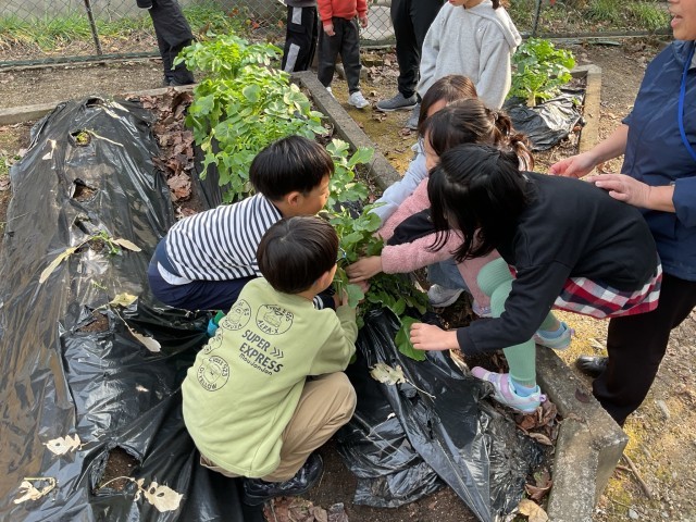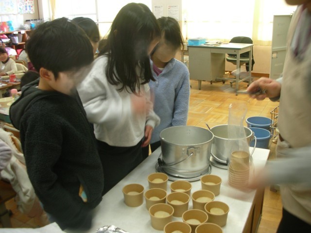 収穫した大根は給食の時間に食べました。子どもたちは大根を「アツアツでおいしい」や「優しい味がする」、「甘い」などと言いながら喜んで食べていました。