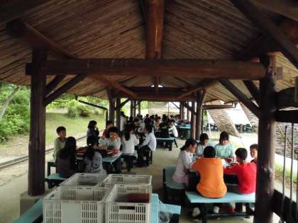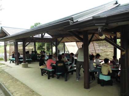 あづま屋で朝食です。しっかり食べて,お茶を補給して,今から楽しみな磯観察の準備をします。