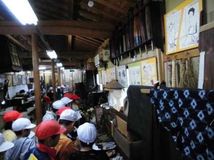 午前中は,京の田舎民具資料館で,昔の道具について教えていただいたり,観察させていただききました。子どもたちには初めて見るものばっかりで,アイロンの代わりに使われていた「ひのし」や「石臼」・「タイプライター」に驚いていたり,農作業で使われていた竜骨水車の動き・役割に感心していました。