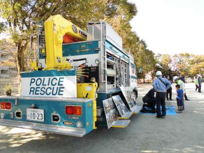 レスキューの車のきて,ブロックを砕く体験