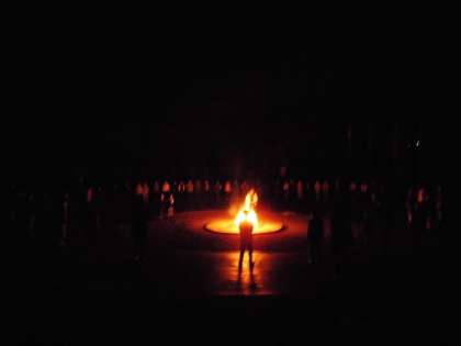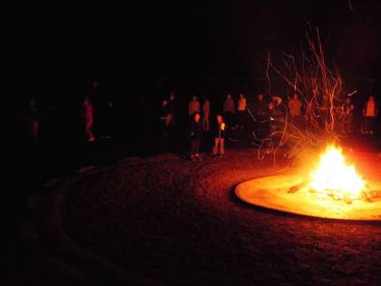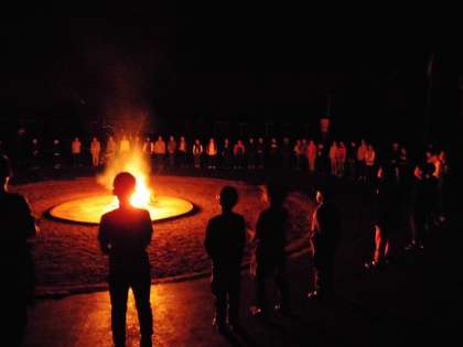 1日目の活動の締めくくりはキャンプファイヤーです。燃えさかる炎を囲んで,ゲームや歌で大いに盛り上がりました。その後に行った星の観察では,雲一つないきれいな夜空に,京都ではなかなかお目にかかれないようなたくさんの星がきれいに見え,あちこちから感動の声が上がっていました。