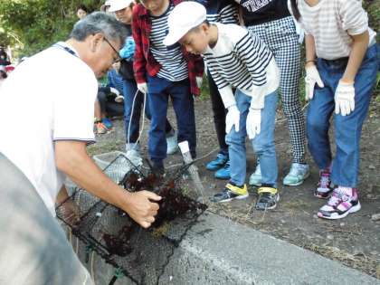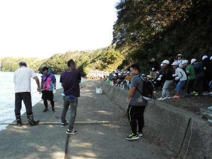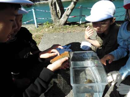 昨日仕掛けておいたかごを上げました。かたずをのんでも守る子供たち。中に生き物が入っていると大きな歓声が深谷水道に響き渡りました。そのあとは,水槽に入れて観察タイム。タツナミガイという変わった生き物や,フグ,ヒトデなどを実際に触って観察しました。