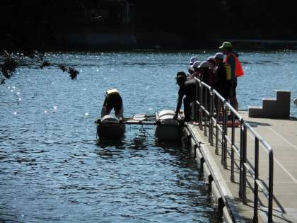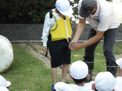 なかよし港でいかだ体験に挑戦しました。安全のためにライフジャケットをつけ,所員さんにこぎ方を教えてもらいました。いざ,大海原へ!!
