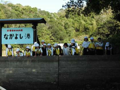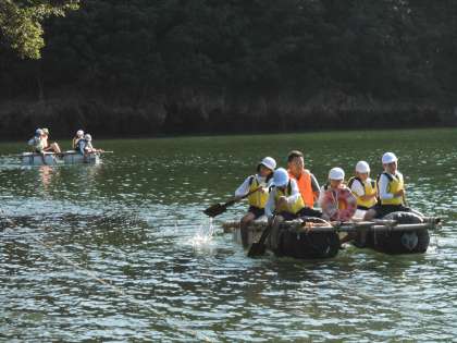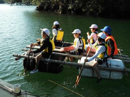 みんなが見守る中,沖に向かって漕ぎ出します。時折吹きつける強い風や,近くを通る船の引き波もなんのその。みんなで協力していかだに乗っての小旅行を楽しみました。