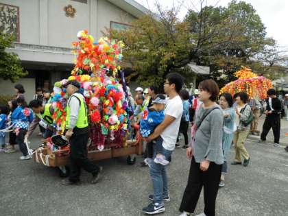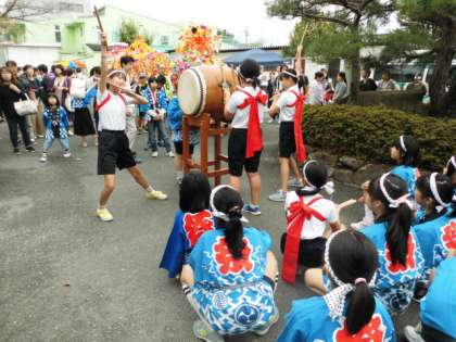 10月13日(日),台風一過。上天気ではありませんでしたが,曇り空の中,『第10回桃山南まつり』が盛大に開催されました。学区の中で,本校児童が太鼓の演奏をします。町内の花笠を先頭に学区内を練り歩き,町内でお祭りが大変盛り上がった中,花笠が学校に到着し,体育館での催しが始まりました。