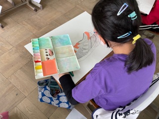 図画工作科では,5年生になって初めての水彩画である『くつの絵』を描きました。細部まで一生懸命に観察し,実物よりも大きく描くことを目標に,最後まで丁寧に下書きしました。使用する水量を考えながら,水彩画独特の美しい絵が仕上がりました。