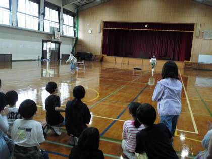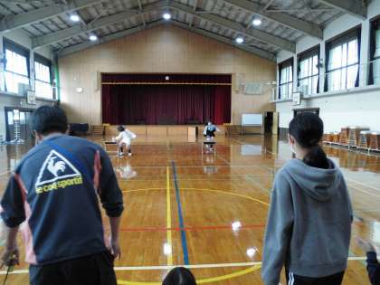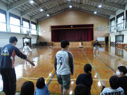 学年お楽しみ会!本当は声を出して応援したいけれど…そこは拍手でがまん!体育館の中央に置いた机と舞台にペットボトルを置きに行くリレーです。ペットボトルを倒さないように気を付けながら走っていました。