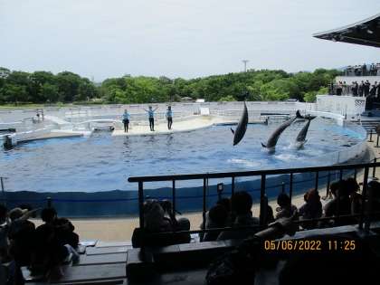 楽しみにしていたイルカショー。GW中で,混雑が心配でしたが,見やすい座席に座れました。かわいくて賢いイルカたちに,みんな拍手喝采です。