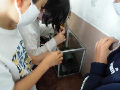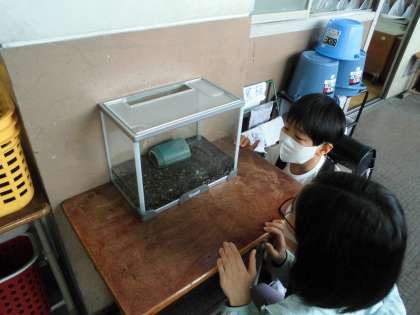 カメがいる水槽にみんな興味津々です。「かわいいなぁ〜」みんなで餌をやりました。