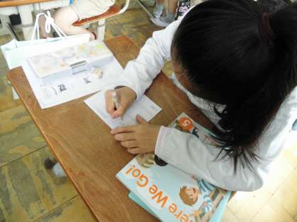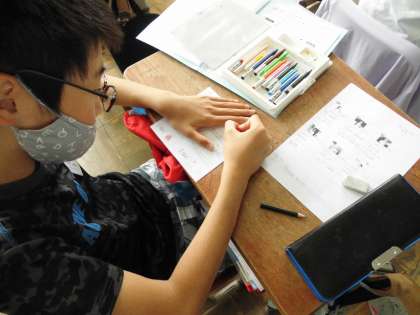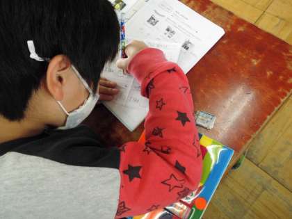好きなものを書いて名刺交換をするための名刺つくりをしています。「何を書こうかまようなぁ」楽しそうに作っています。