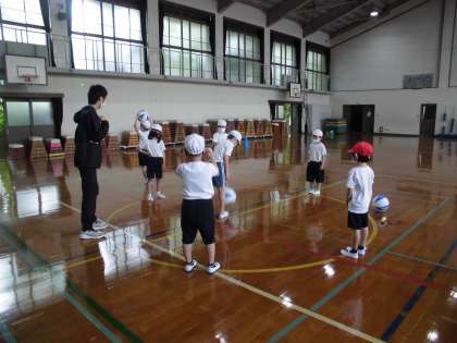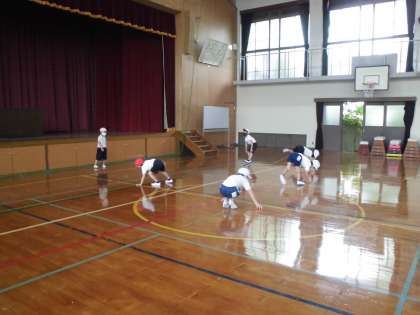 体育館で,体ほぐしの運動をしました。リーダーを決め,リーダーが考えた動きをみんなでしたり,ボールキャッチゲームをしたりして楽しみました。