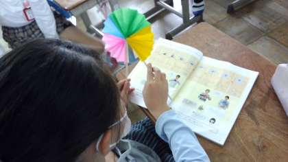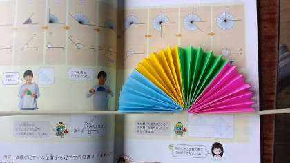 折り紙で扇を作って,色々な角を作りました。半回転させてできる角や一回転できる角を楽しそうに作っていました。動かしている途中に直角ができることに気がついている子もいました。今後は,分度器を使って角度を測る学習を進めていきます。