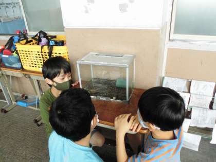 カメを囲んでお話し中!カメの餌やりやお掃除について相談しているようです。